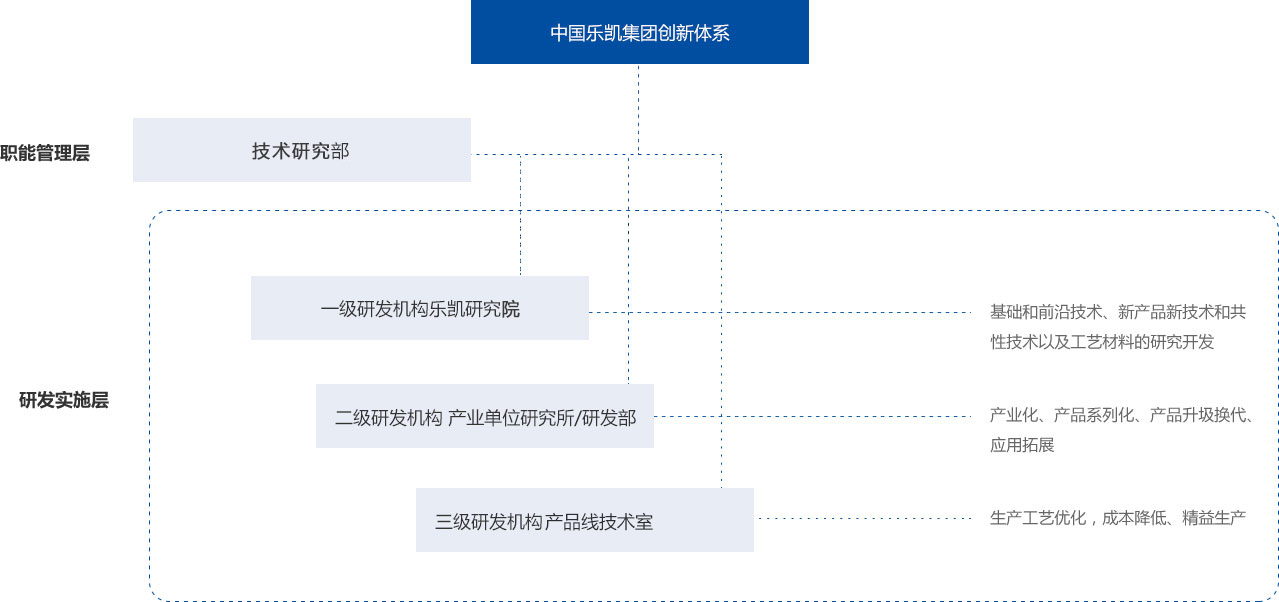中國樂(lè )凱擁有以技術(shù)創(chuàng )新規劃系統為引領(lǐng)和牽引、以技術(shù)研究系統為主體支撐、以創(chuàng )新管理系統促進(jìn)體制機制優(yōu)化的完善、高效的技術(shù)創(chuàng )新體系。創(chuàng )新規劃系統主要發(fā)揮引領(lǐng)、牽引作用,把準脈搏、認清發(fā)展趨勢,明確重點(diǎn)、謀劃創(chuàng )創(chuàng )新方向,為中國樂(lè )凱持續發(fā)展提供動(dòng)力和保障;技術(shù)研究系統主要是深入開(kāi)展核心技術(shù)研究,進(jìn)行產(chǎn)品和關(guān)鍵原材料開(kāi)發(fā)井實(shí)現產(chǎn)業(yè)化,支撐中國樂(lè )凱發(fā)展,是中國樂(lè )凱技術(shù)創(chuàng )新體系的主體和支撐;創(chuàng )新管理系統主要發(fā)揮體制機制促進(jìn)作用,監控創(chuàng )新體系有效運行,發(fā)揮支撐保障作用,推動(dòng)技術(shù)創(chuàng )新體系健康良性發(fā)展。